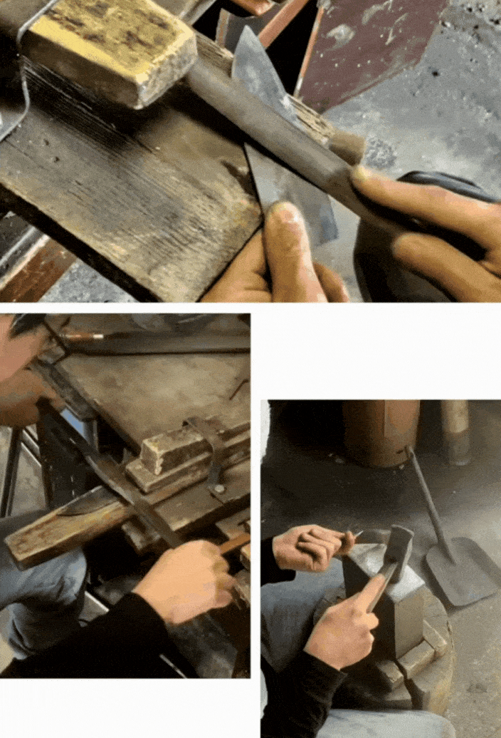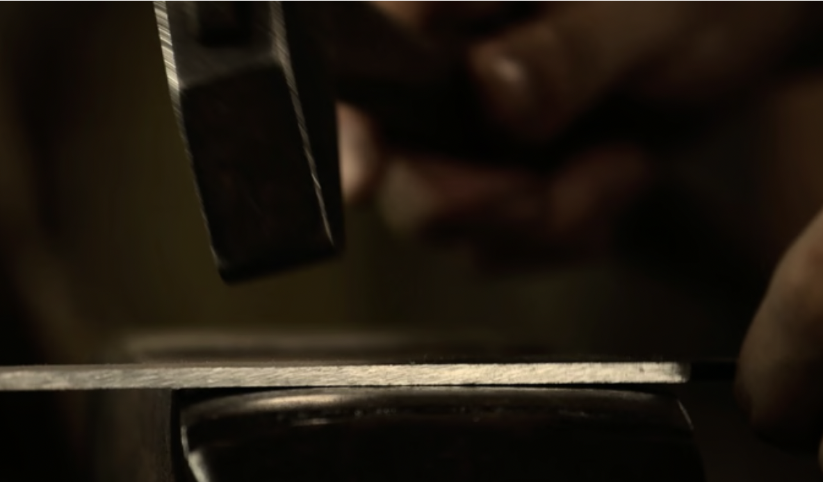 職人がハンマーやプレス機で叩き、金属を延ばして包丁の基本形をつくります。