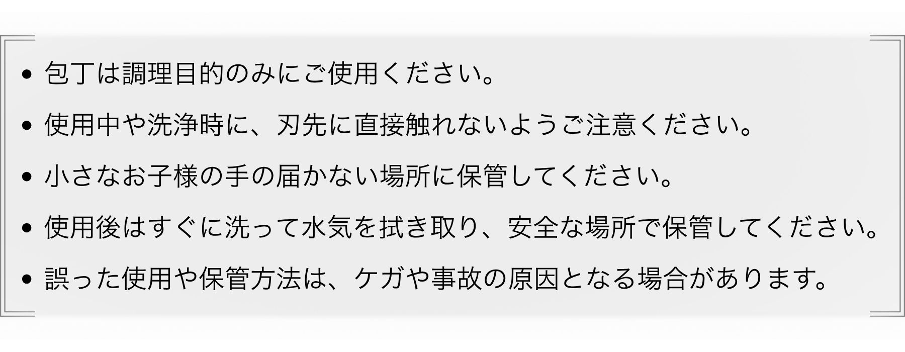 - この商品は「料理用包丁」として設計されています。用途以外でのご使用はお控えください。