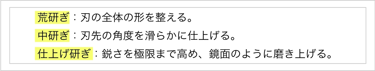 - 定期的に研ぎ直すことで、長く切れ味を保てます。