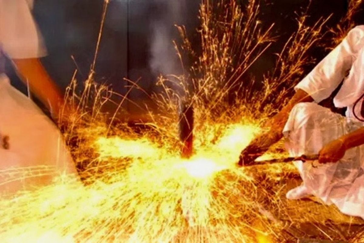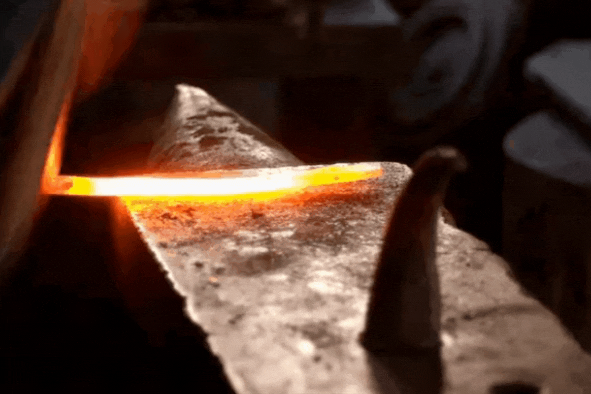 職人がハンマーやプレス機で叩き、金属を延ばして包丁の基本形をつくります。